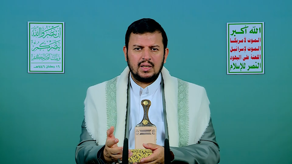 O líder iemenita do Ansar Allah, Sayyed Abdul-Malik al-Houthi, durante um discurso televisionado no domingo, 16 de março de 2025 (mídia militar iemenita)