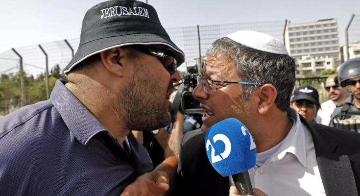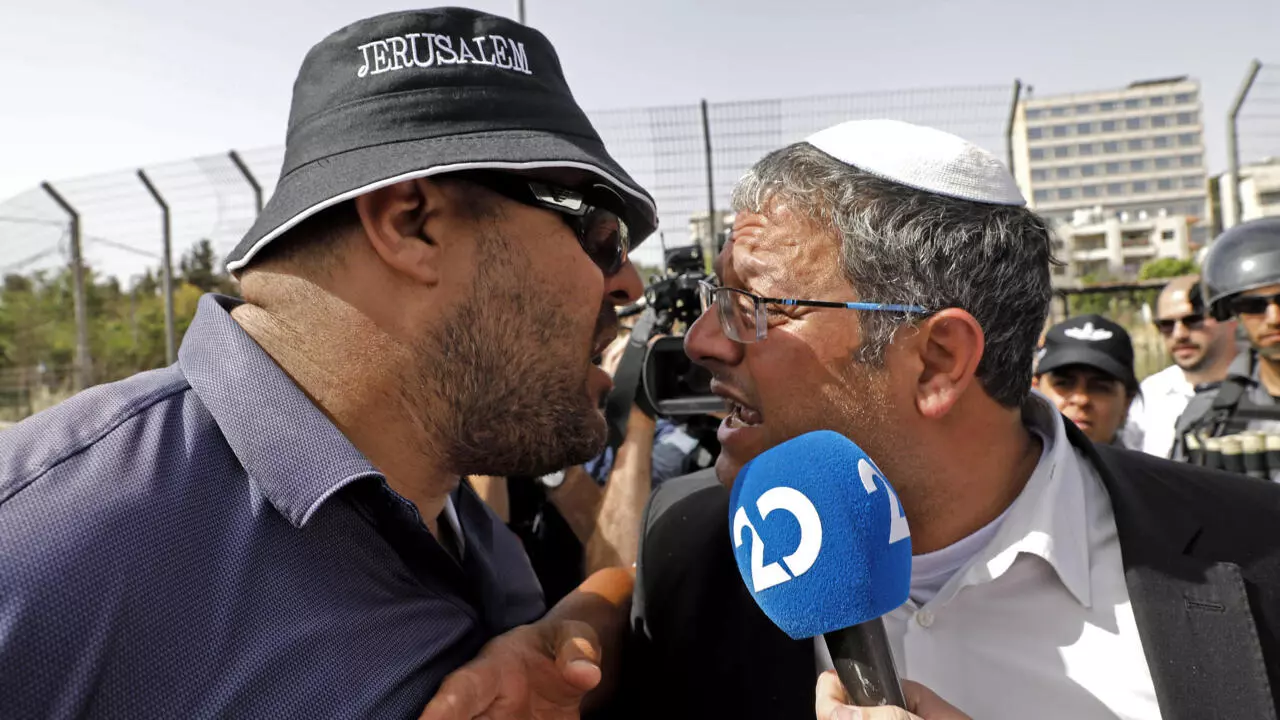 A Palestinian man argues with Israeli Knesset member and head of the far right Jewish Power (Otzma Yehudit) party Itamar Ben-Gvir in the Sheikh Jarrah neighbourhood of the Israeli-annexed east Jerusalem on May 10, 2021. © Gil Cohen-Magen, AFP