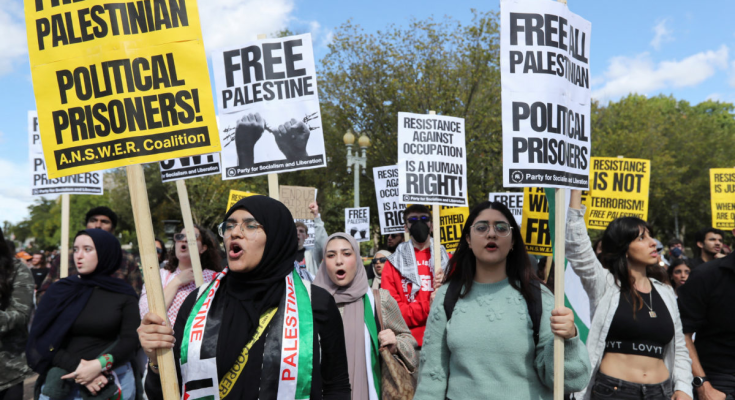 Photo: Demonstrators rally across the U.S. in response to the Israel-Hamas conflict / Reproduction / PBS NewsHour, [date if known]