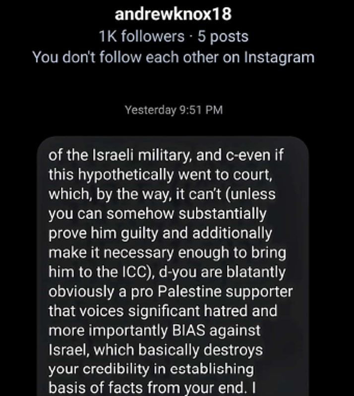 Enquanto isso, o advogado brasileiro foi ameaçado e intimidado depois de assumir o caso, com muitas ameaças feitas no Instagram supostamente por lobbies pró-sionistas.